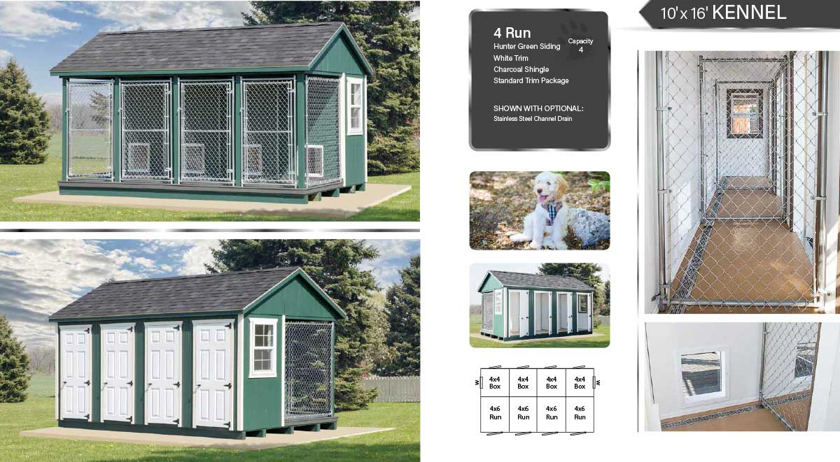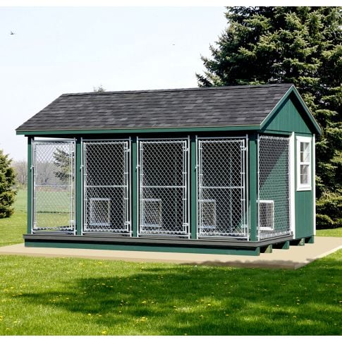 This High quality, Amish Handcrafted 10 x 16 Large 4 Run Dog Kennel is proudly Made in America! This dog kennel shipped fully assembled and is available with many upgrades. Do you live in cold weather climate? All of our kennels come fully insulated with R-7 insulation (R-11 insulation is available upon request) and an insulated standard door. Select the insulated metal roof and electric package with space heater for additional insulation and warm.
