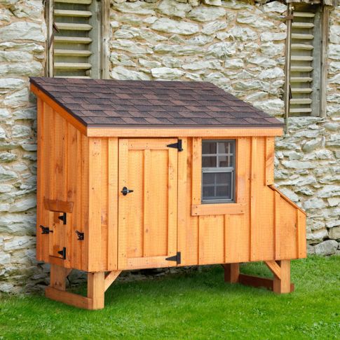 This 3-foot by 5ft chicken coop supports as many as 9 chickens. Designed and handcrafted by the Amish of Pennsylvania, this backyard chicken coop is constructed of pine wood and stained a nice cedar color.