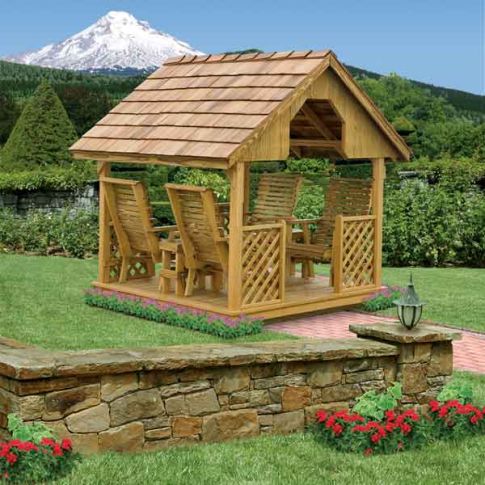 Amish Made 7 x 7ft Chalet with 4 Glider Chairs and 2 Tables - Handcrafted using #1 Pressure-treated lumber, these gazebos include gliders and tables, making it the perfect structure for relaxing during a nice summer day.