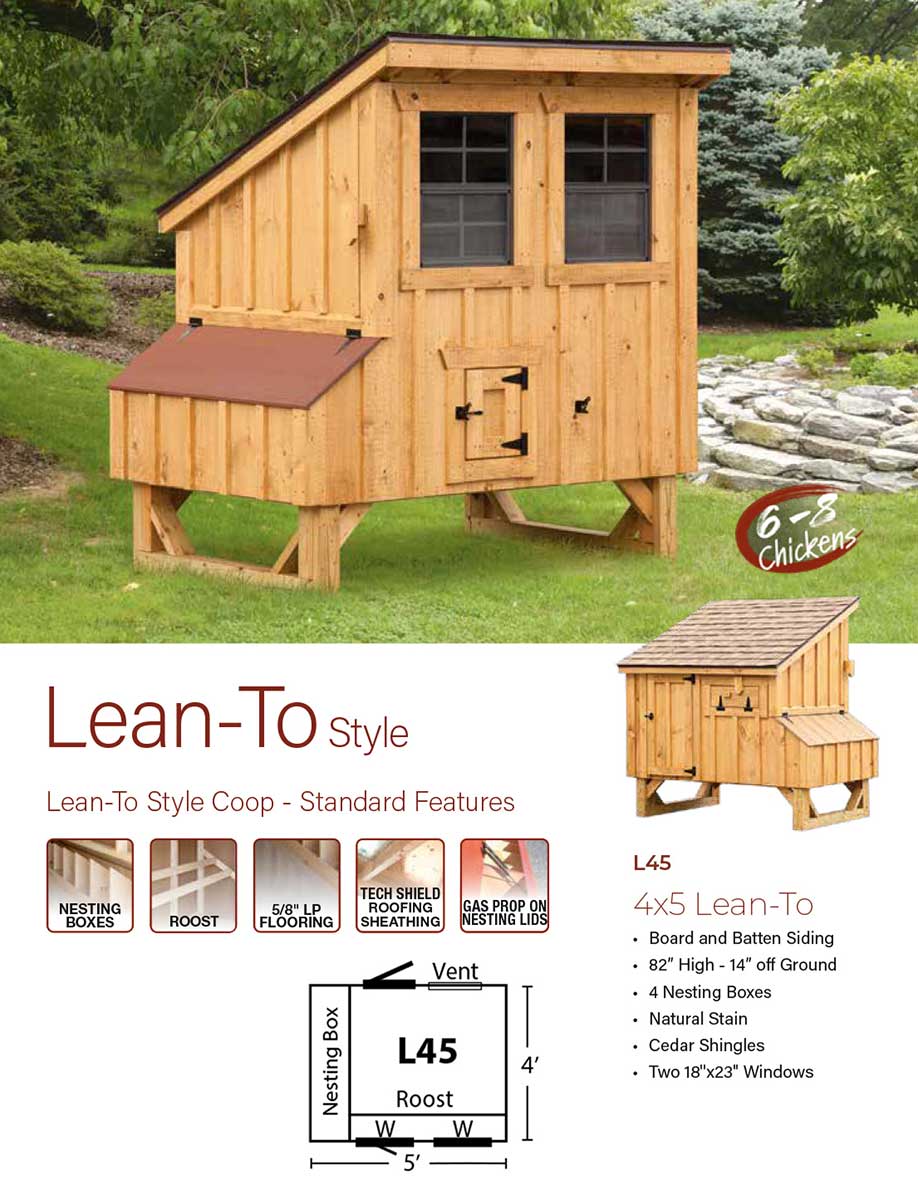 Enjoy fresh eggs and family fun with this quality chicken coop! Handcrafted by a family-owned business in Pennsylvania, these chicken coops are built to last a lifetime while providing comfort and safety for your feathered friends and easier egg collecting for you. From the Lean-to collection, this 4 foot by 5 foot chicken coop could be exactly what you need. Price includes curbside shipping to your home.