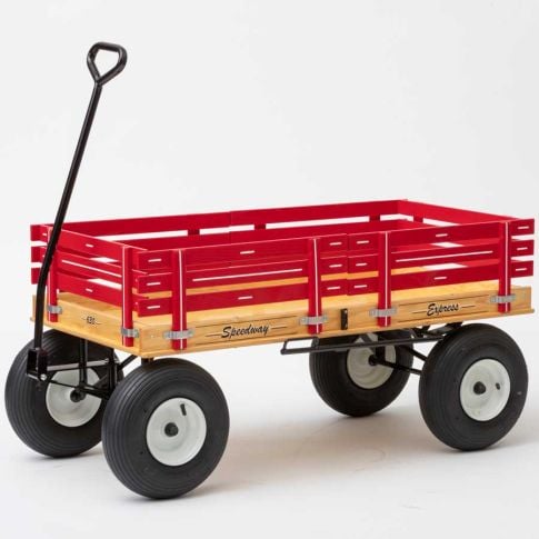 Each Speedway Express is handmade in the Amish shop to conform to strict specifications - they are sturdy, well-built, and long-lasting. Equipped with "D" handles for better grip and durability, the wagon’s removable 10”H side rails are made with Ash wood, stapled and glued for a stronger bond, and the bed is made with premium grade ½" plywood. Each wagon features no tilt auto turn steering, air tire ball bearing wheels, and a welded heavy gauge steel framework to handle heavy loads up to 1000 pounds. The chassis is 1/8" thick 3/4"x 3/4" angle steel. The braces are 3/16" thick angle steel. The axle is 5/8" in diameter. These wagons are suitable for pleasure riding, gardening, yard work, and more.