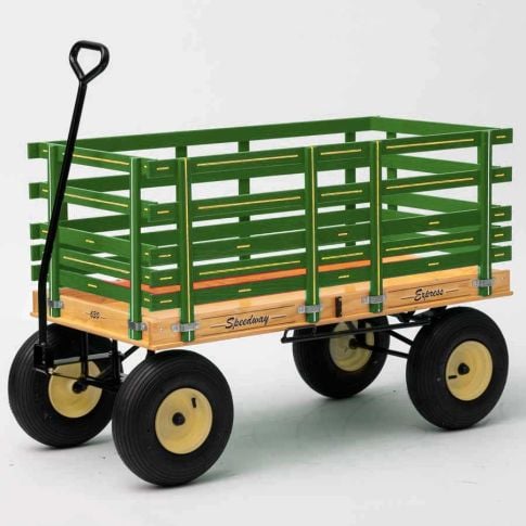Each Speedway Express is handmade in the Amish shop to conform to strict specifications - they are sturdy, well-built, and long-lasting. Equipped with "D" handles for better grip and durability, the wagon’s removable 10”H side rails are made with Ash wood, stapled and glued for a stronger bond, and the bed is made with premium grade ½" plywood. Each wagon features no tilt auto turn steering, air tire ball bearing wheels, and a welded heavy gauge steel framework to handle heavy loads up to 1000 pounds. The chassis is 1/8" thick 3/4"x 3/4" angle steel. The braces are 3/16" thick angle steel. The axle is 5/8" in diameter. These wagons are suitable for pleasure riding, gardening, yard work, and more.