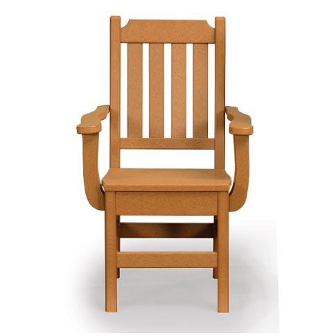 This traditional patio dining arm chair is from our Keystone Collection and made from durable Poly. Offered in a wide array of colors and optional cushions for extra comfort, you will spend many nights relaxing on your patio, enjoying an evening dinner with family and friends.