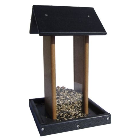 This bird feeder is constructed with poly lumber. This eco-friendly substance is made from recycled plastic products and unlike wood, it requires no maintenance such as periodic re-painting.