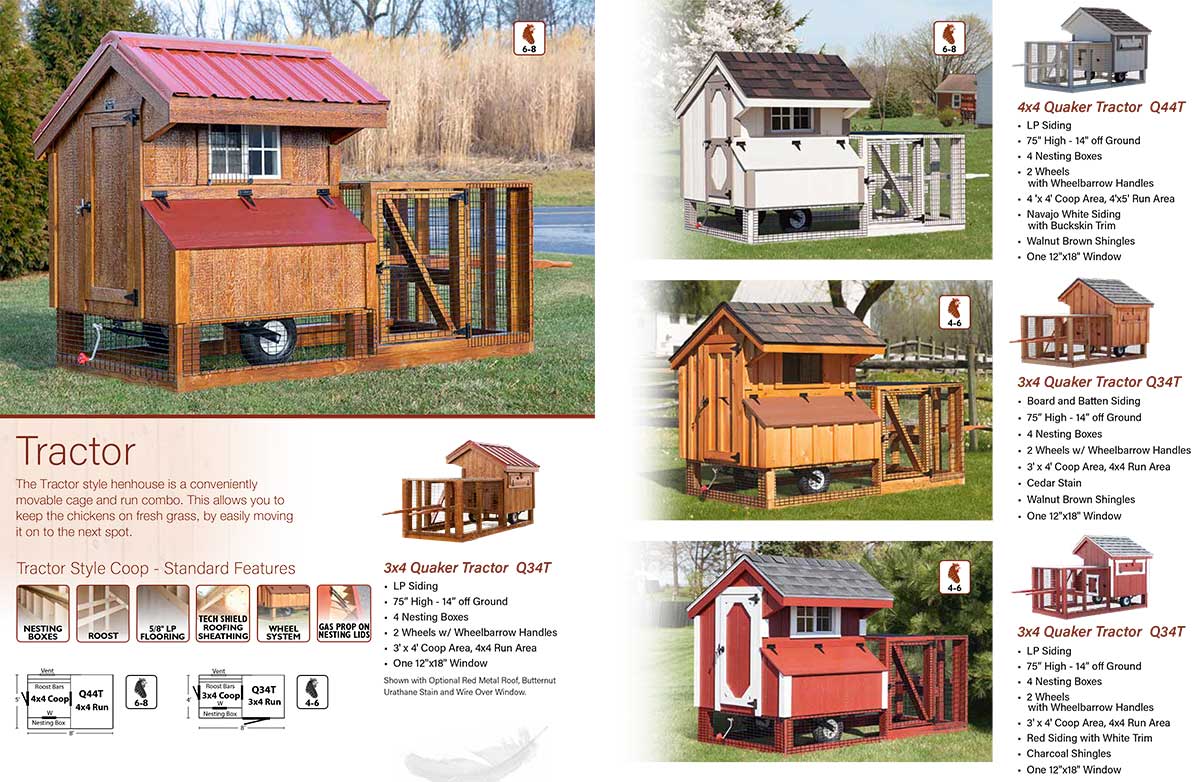 See above for info on our 3x4 and 4x4 Tractor Coops. We have many different styles and sizes to choose from. We can also build custom coops.